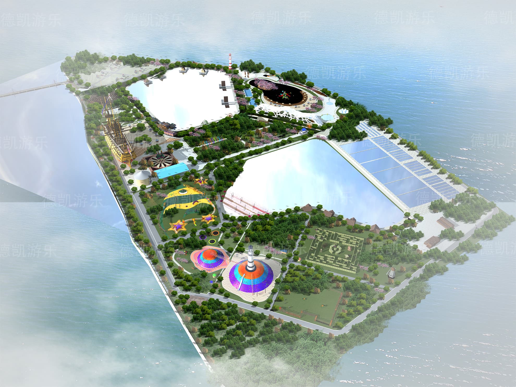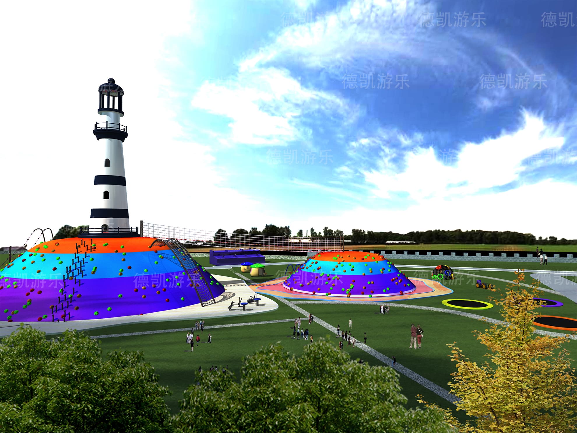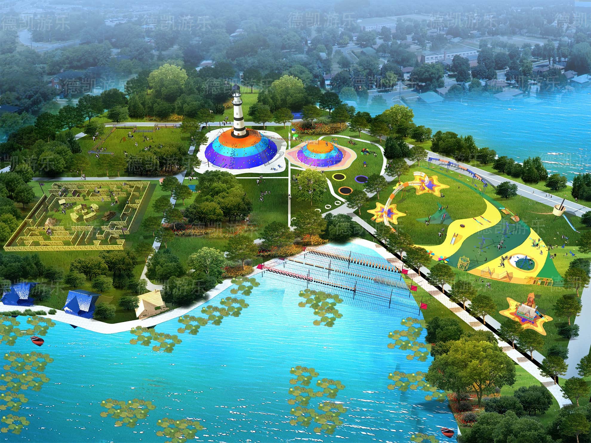 這部分主要呈現(xiàn)的是陸上無動力兒童游樂設備,主要的能看見的有迷宮、燈塔、蹦床、兒童拓展組合、水上蕩橋部分、弧形秋千、爬網木桶組合等。
