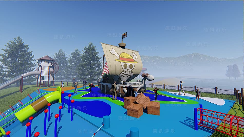 主要顯示海盜船和裝寶藏的箱子的細(xì)節(jié),間接顯示斜坡的傾斜度,斜坡上設(shè)備的細(xì)節(jié),還有遠(yuǎn)處草坪上充滿探險(xiǎn)滑梯。